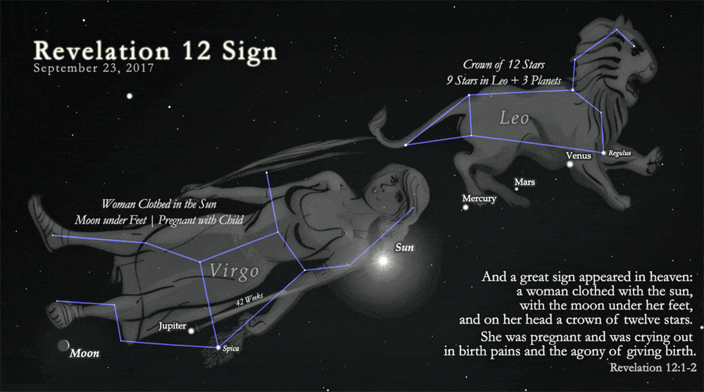 On September 23, 2017 this sign was fulfilled. The sun was in the zodiac constellation Virgo – “a woman clothed with the sun”. The moon was at the feet of Virgo – “with the moon under her feet”. The ‘nine’ stars of the zodiac constellation Leo, plus three planets (Mercury, Venus, and Mars), was at the head of Virgo – “on her head a crown of 12 stars”. The planet Jupiter was in the centre of Virgo, and, as the weeks pass after September 23, Jupiter exited Virgo to the east, past her feet, as if she was giving birth – “She was with child and wailed aloud in pain as she laboured to give birth”. Jupiter is the largest of the planets, and could be called the “king” of the planets – “She gave birth to a son, a male child, destined to rule all the nations with an iron rod”.